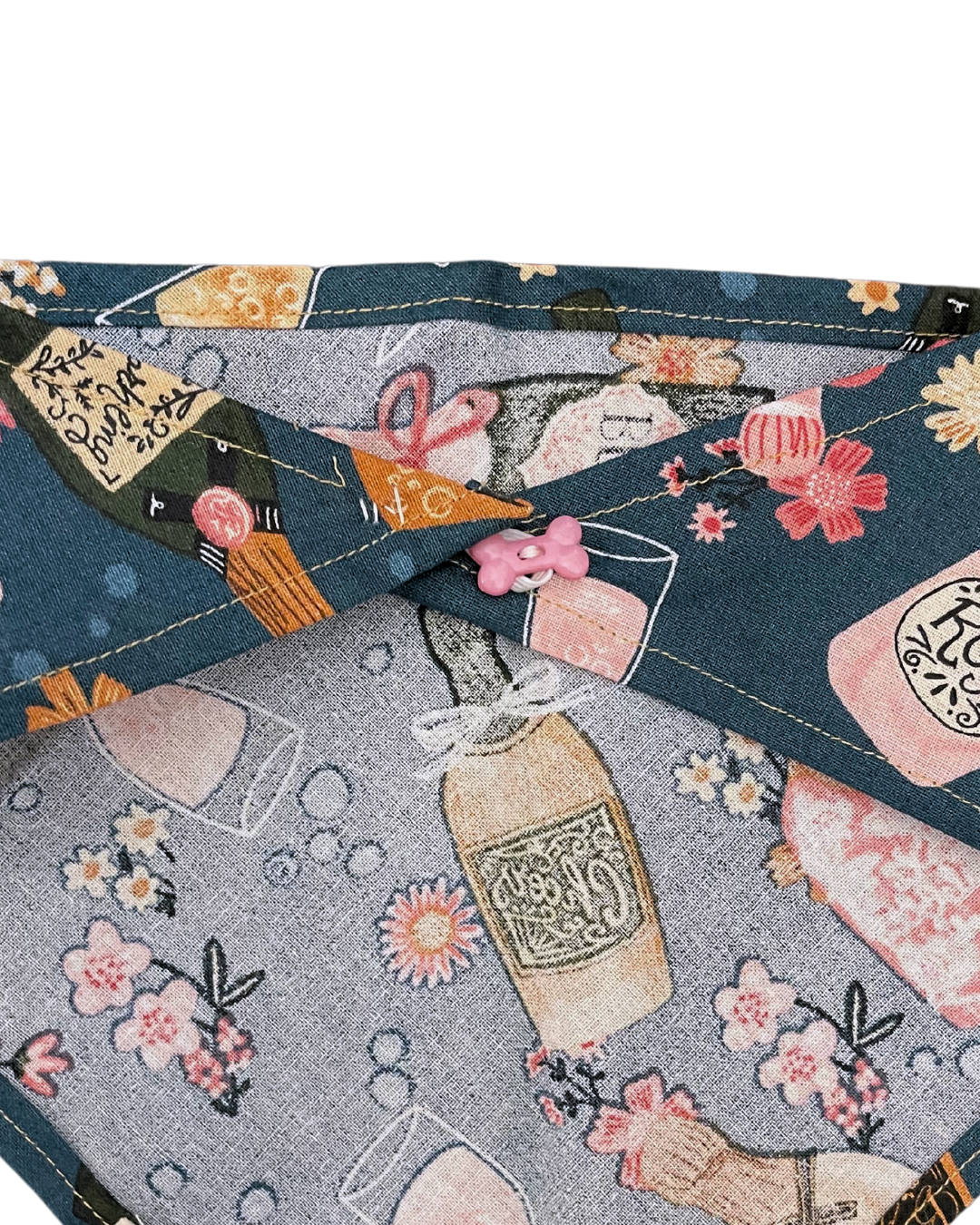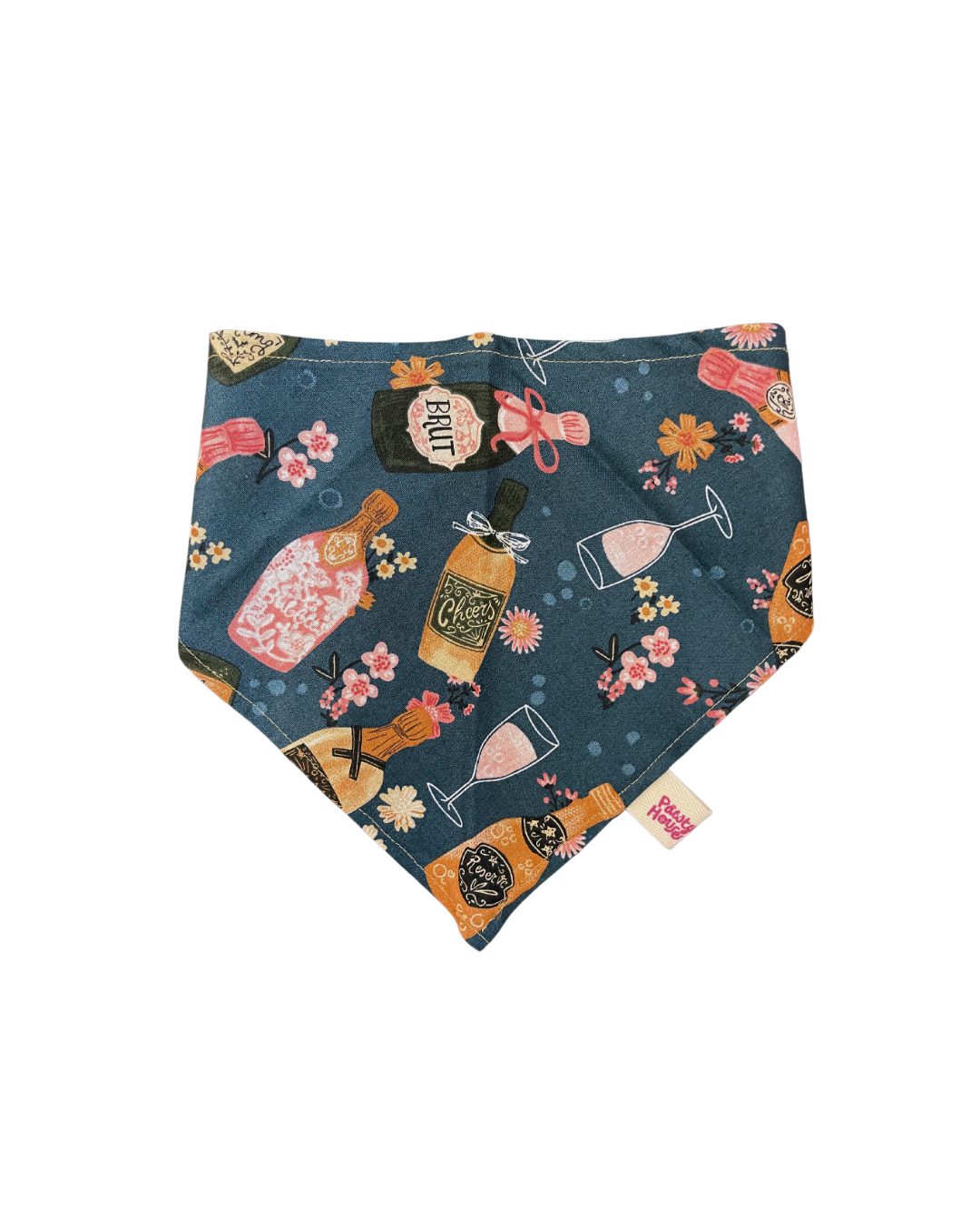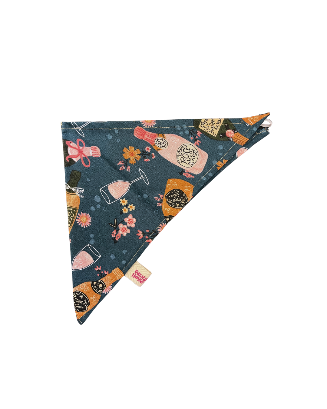 Cheers to your pup’s chic new look! This elegant dark teal bandana is adorned with a charming vintage champagne bottle pattern, perfect for dogs with a taste for the finer things in life.