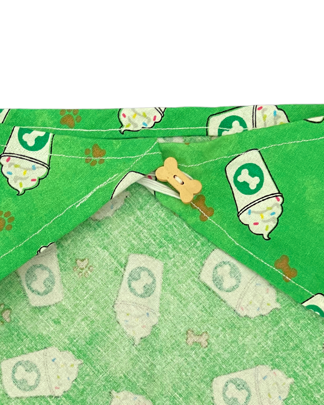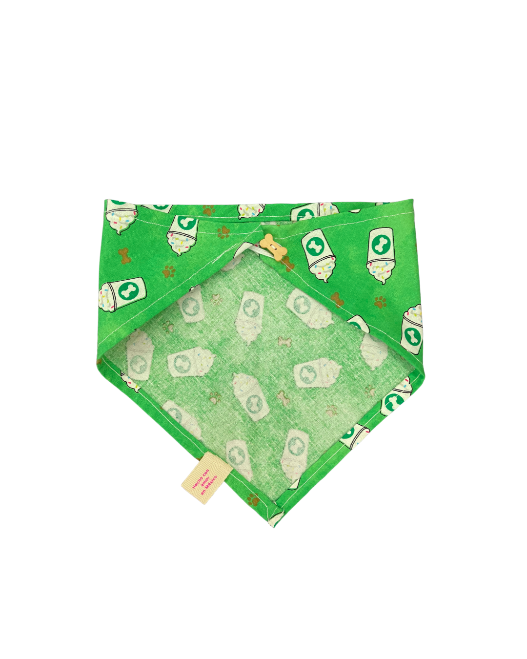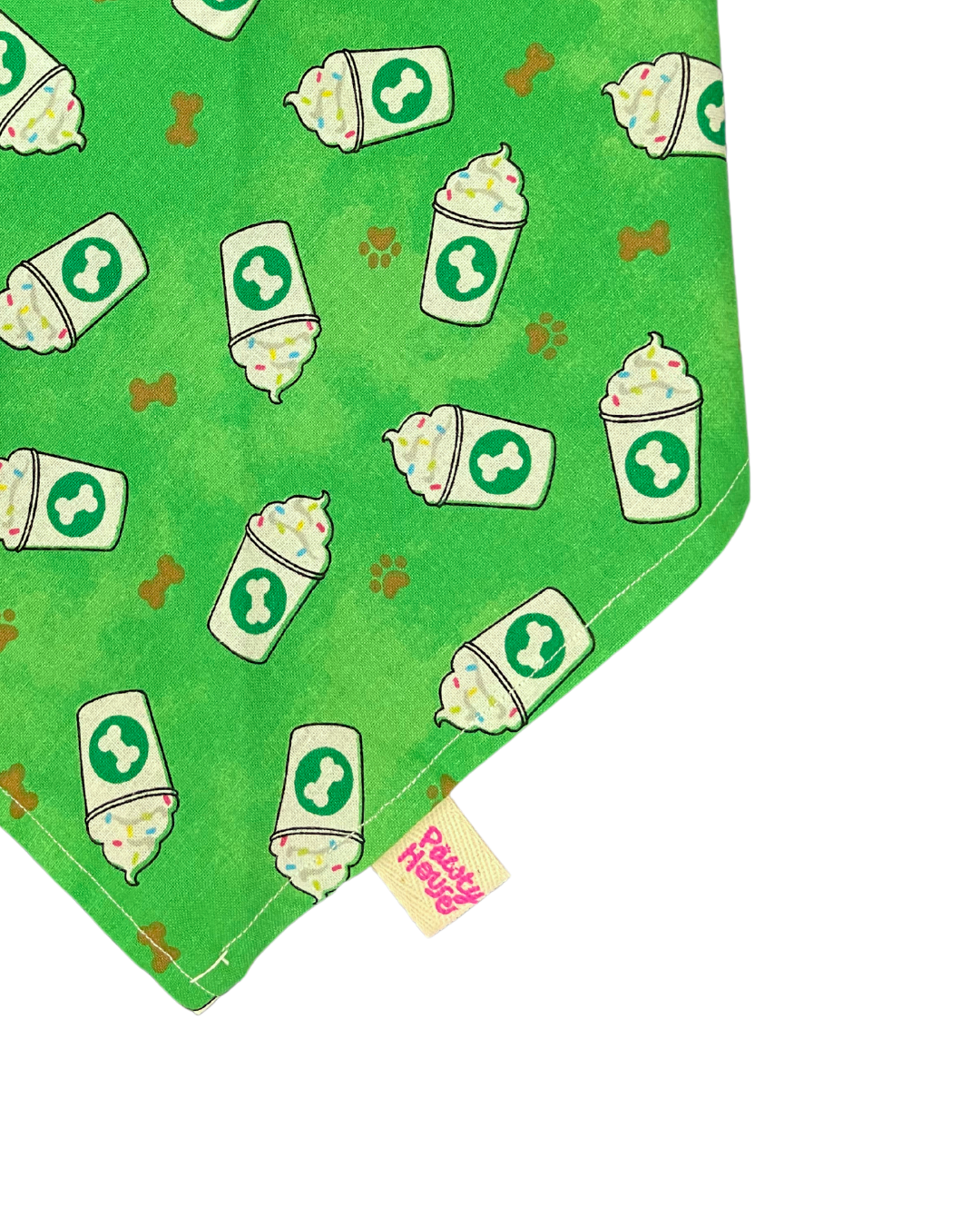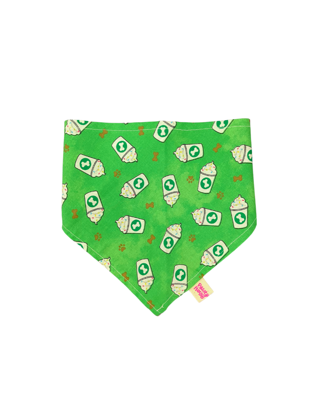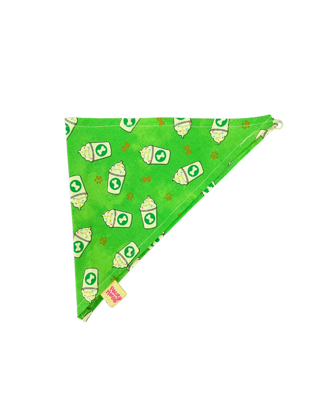 The perfect dog bandana for a coffee date with your pup. Green bandana with cappuccino cups, dog paw prints and bone pattern.